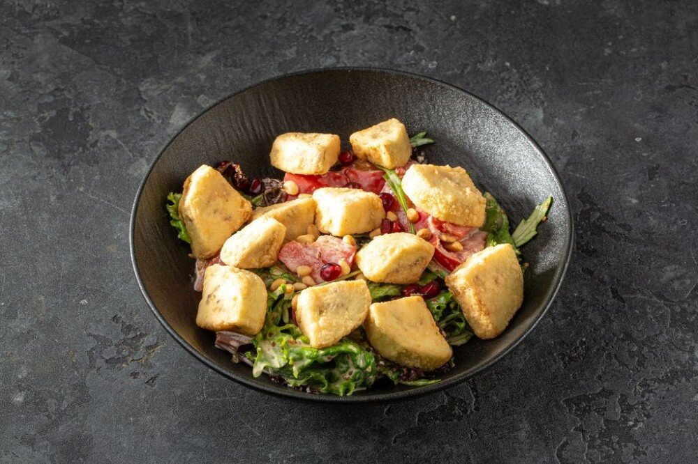 Хрустящие баклажаны,томаты, микс салата, гранат, кедровые орешки,ореховый соус.